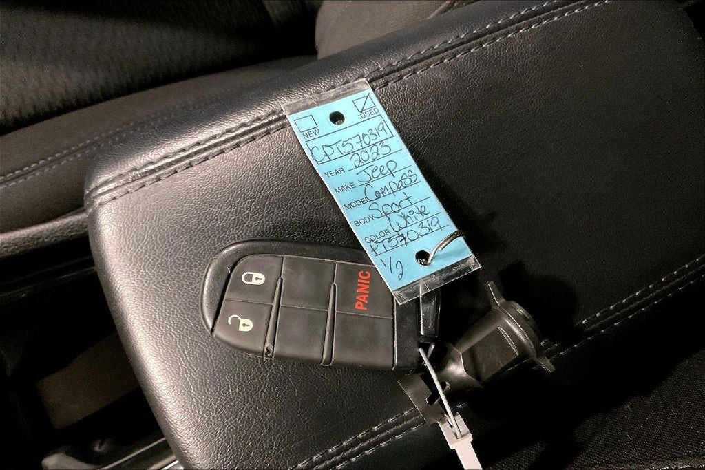 2023 Jeep Compass Sport Sport Bright White Clearcoat 4D Sport Utility 4WD 2.0L I4 DOHC 8-Speed Automatic New Feature, Backup camera, Bluetooth®, Compass Sport, 4D Sport Utility, 2.0L I4 DOHC, 8-Speed Automatic, 4WD, Bright White Clearcoat, Black Cloth, 17 x 7.0 Aluminum Wheels, 3.73 Final Drive Ratio, 4-Wheel Disc Brakes, 6 Speakers, ABS brakes, Air Conditioning, Alloy wheels, AM/FM radio: SiriusXM, Brake assist, Bumpers: body-color, Cloth Low-Back Bucket Seats, Compass, Delay-off headlights, Driver door bin, Driver vanity mirror, Dual front impact airbags, Dual front side impact airbags, Electronic Stability Control, Four wheel independent suspension, Front anti-roll bar, Front Bucket Seats, Front Center Armrest w/Storage, Front License Plate Bracket, Front reading lights, Fully automatic headlights, Heated door mirrors, Illuminated entry, Knee airbag, Low tire pressure warning, Occupant sensing airbag, Outside temperature display, Overhead airbag, Overhead console, Panic alarm, ParkView Rear Back-Up Camera, Passenger door bin, Passenger vanity mirror, Power door mirrors, Power steering, Power windows, Quick Order Package 29A, Radio: Uconnect 5 w/10.1 Display, Rear anti-roll bar, Rear seat center armrest, Rear window defroster, Rear window wiper, Remote keyless entry, Security system, Speed control, Split folding rear seat, Spoiler, Steering wheel mounted audio controls, Tachometer, Telescoping steering wheel, Tilt steering wheel, Traction control, Trip computer, Variably intermittent wipers.