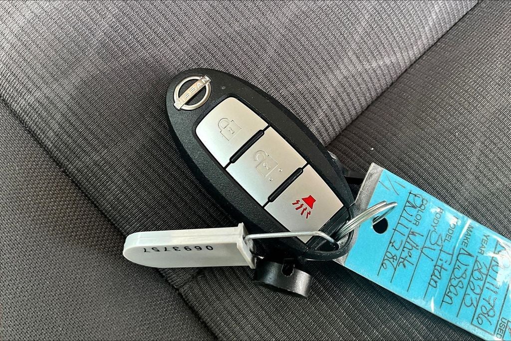2023 Nissan Titan SV SV Glacier White 4D Crew Cab RWD 5.6L V8 DOHC 32V 400hp 9-Speed Automatic 1 Owner, Titan SV, 4D Crew Cab, 5.6L V8 DOHC 32V 400hp, 9-Speed Automatic, RWD, Glacier White, Black Vinyl, 3.69 Axle Ratio, 4-Wheel Disc Brakes, 6 Speakers, ABS brakes, Air Conditioning, Alloy wheels, AM/FM radio: SiriusXM, Auto High-beam Headlights, Blind Spot Warning, Brake assist, Bumpers: chrome, Cloth Seat Trim w/Vinyl Bolsters, Driver door bin, Driver vanity mirror, Dual front impact airbags, Dual front side impact airbags, Electronic Stability Control, Front anti-roll bar, Front Center Armrest w/Storage, Front reading lights, Front Split Bench Seat (40/20/40), Front wheel independent suspension, Fully automatic headlights, Heated door mirrors, Illuminated entry, Knee airbag, Low tire pressure warning, NissanConnect featuring Apple CarPlay and Android Auto, Occupant sensing airbag, Outside temperature display, Overhead airbag, Overhead console, Panic alarm, Passenger door bin, Passenger vanity mirror, Power door mirrors, Power steering, Power windows, Radio data system, Radio: NissanConnect AM/FM, Rear anti-roll bar, Rear Parking Sensors, Rear reading lights, Rear seat center armrest, Rear step bumper, Rear window defroster, Remote keyless entry, Security system, Speed control, Speed-Sensitive Wipers, Split folding rear seat, Steering wheel mounted audio controls, Tachometer, Telescoping steering wheel, Tilt steering wheel, Traction control, Trip computer, Variably intermittent wipers, Voltmeter, Wheels: 18 x 8 Painted & Machined Alloy.