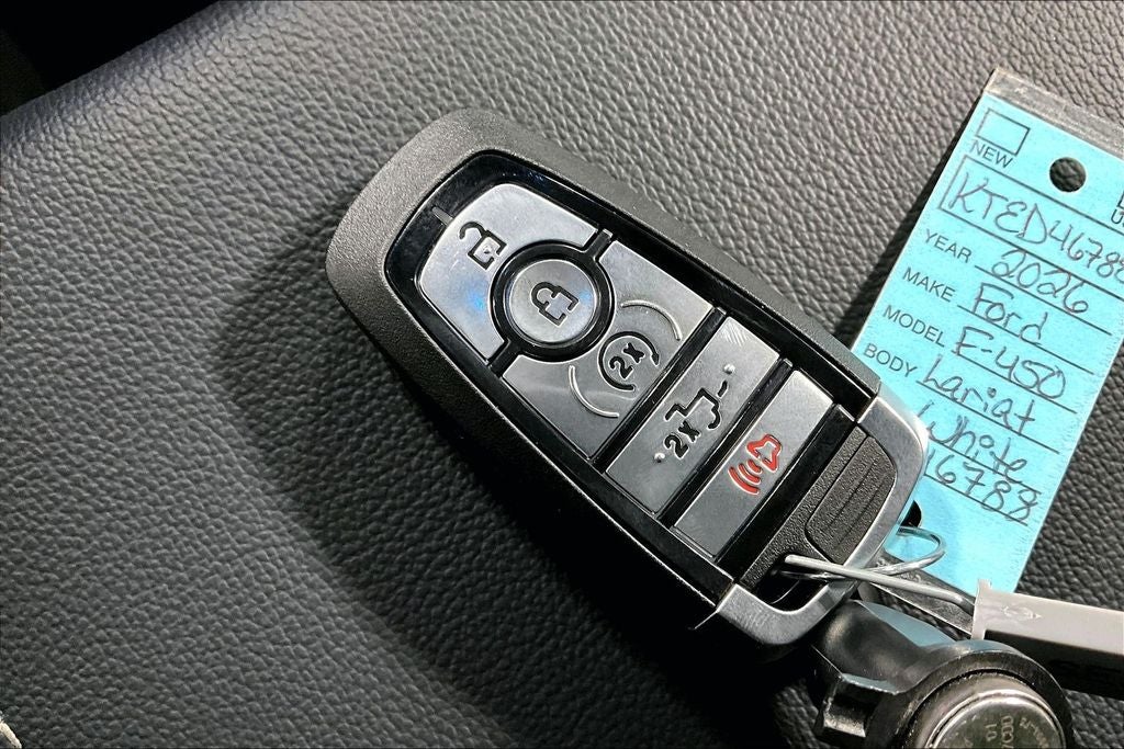 2026 Ford F-450SD Lariat DRW Lariat Star White Metallic Tri-Coat DRW 4D Crew Cab 4WD 6.7L High Output Power Stroke V8 Diesel 10-Speed Automatic 1 Owner, New Feature, Apple CarPlay / Android Auto, Backup camera, Blind Spot Monitoring, Bluetooth®, Heated seats, Leather seats, Remote Start, CUSTOM COLOR MATCHED, LIFTED, CUSTOM WHEELS, F-450 SuperDuty Lariat DRW, 4D Crew Cab, 6.7L High Output Power Stroke V8 Diesel, 10-Speed Automatic, 4WD, Star White Metallic Tri-Coat, Black Onyx Premium Synthetic, 19.5 Forged Polished Aluminum Wheels, 360-Degree Camera, 360-Degree Camera Package, 4-Wheel Disc Brakes, ABS brakes, Air Conditioning, Alloy wheels, BLIS with Cross-Traffic Alert, Brake assist, Compass, Delay-off headlights, Dual front impact airbags, Dual front side impact airbags, Dual rear wheels, Electronic Stability Control, Emergency communication system: SYNC 4 911 Assist, Flow-Through Console, Ford Connectivity Package (1-Year Included), Front ActiveX Trimmed 40/Console/40 Seats, Front anti-roll bar, Front License Plate Bracket, Front reading lights, Fully automatic headlights, GVWR: 14,000 Lb Payload Package, Heated door mirrors, Illuminated entry, Internet access capable: 5G Modem - Ford Connectivity Package, LED Center High-Mounted Stop Lamp (CHMSL) Camera, Limited Slip with 4.30 Axle Ratio, Low tire pressure warning, Navigation system: Connected Navigation, Order Code 678A, Outside temperature display, Overhead airbag, Overhead console, Panic alarm, Passenger vanity mirror, Power door mirrors, Power steering, Power windows, Radio: B&O Sound System by Bang and Olufsen, Rear anti-roll bar, Rear Parking Sensors, Rear reading lights, Rear step bumper, Remote keyless entry, Security system, SiriusXM with 360L, Speed control, Split folding rear seat, Steering wheel mounted audio controls, SYNC 4 with Enhanced Voice Recognition, Tachometer, Telescoping steering wheel, Tilt steering wheel, Traction control, Trip computer, Turn signal indicator mirrors, Twin Panel Power Moonroof, Variably intermittent wipers.